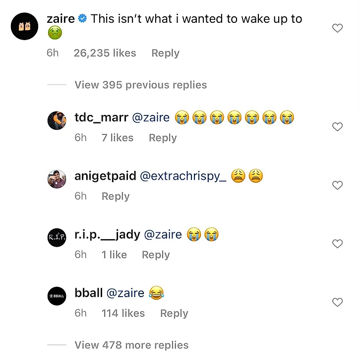 Сын Уэйда Зайр отреагировал, написав, что его не впечатлил пост в инстаграме отца: «Не то, что я хотел увидеть после пробуждения».