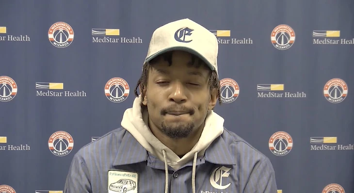 Защитник «Уизардс» Брэдли Бил во время пресс-конференции сделал забавное лицо после вопроса журналиста о том, следит ли он за «Рокетс» в новом сезоне.