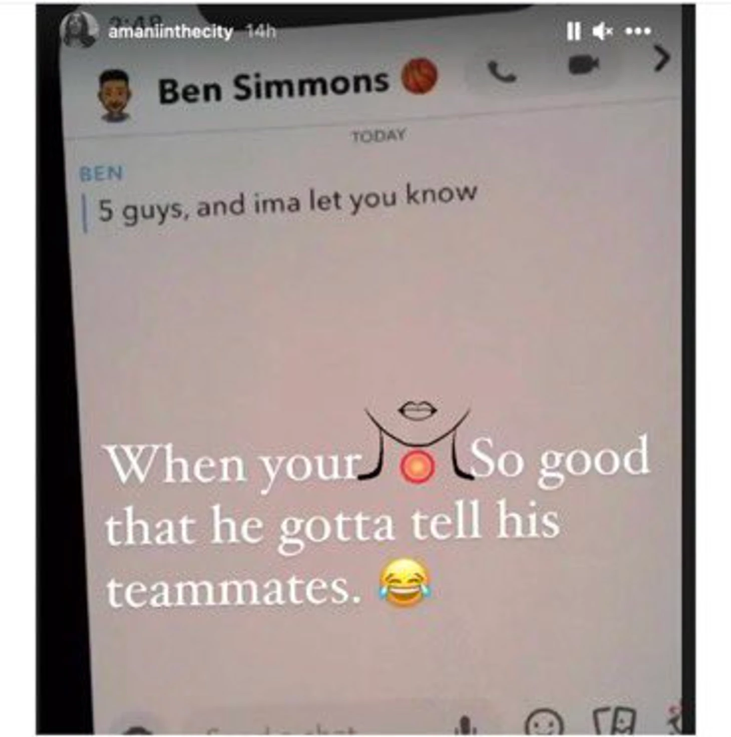 Амани выложила скриншоты, на которых, как она утверждает, запечатлена ее переписка с австралийцем. По словам модели, баскетболист был готов организовать ее перелет в Филадельфию.