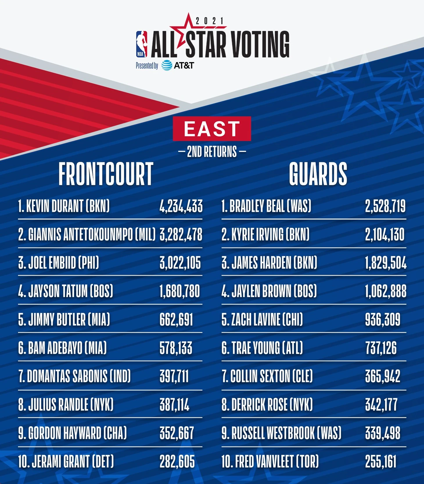 В Западной конференции лидирует форвард «Лейкерс» Леброн Джеймс, у которого 4 369 533 голосов. На Востоке 4 234 433 голоса отдано за форварда «Нетс» Кевина Дюрэнта – это меньше, чем у Леброна. Еще неделю назад общим лидером голосования был именно Дюрэнт.