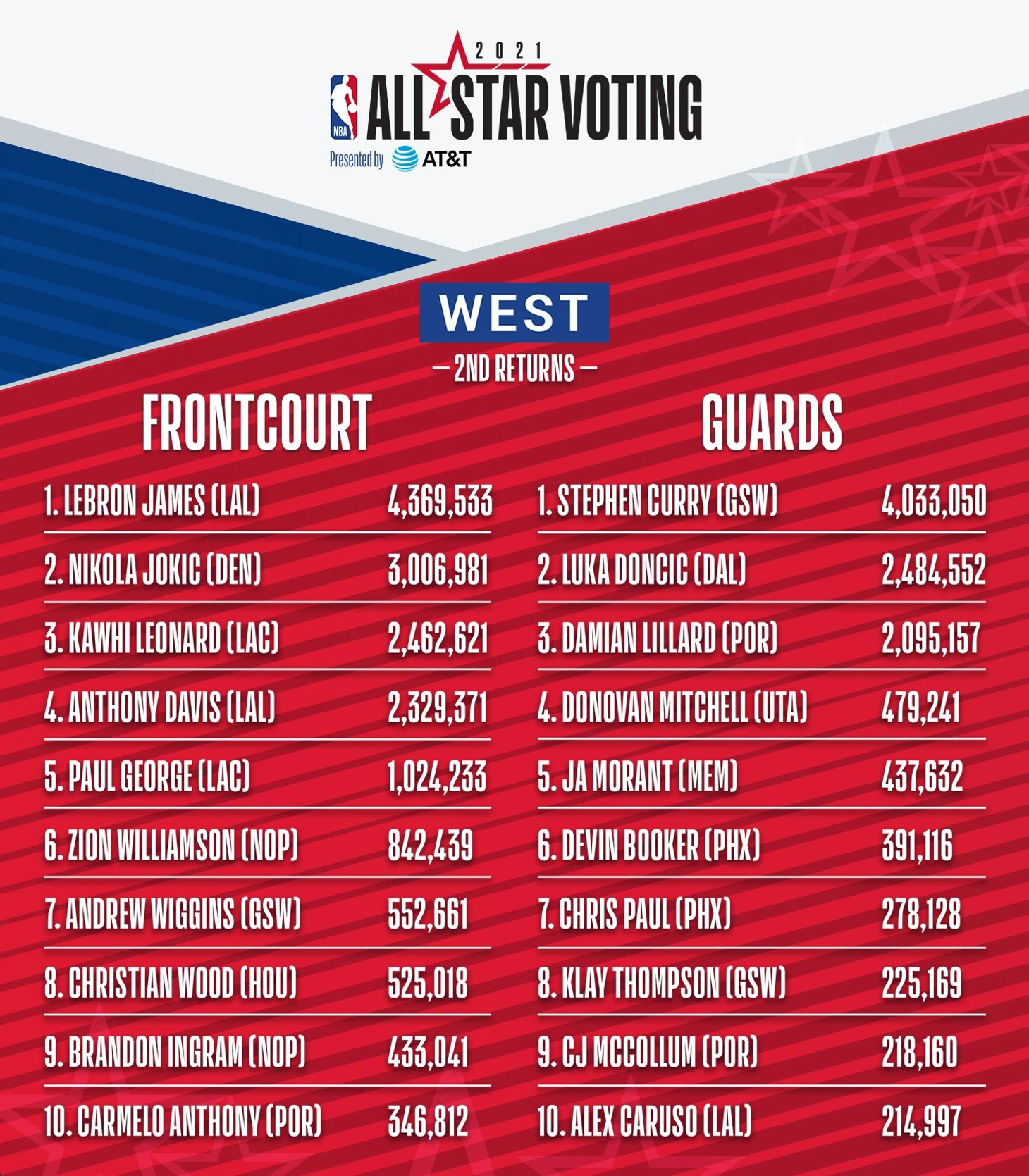 1. Леброн Джеймс («Лейкерс») – 4 369 533 (здесь и далее – все позиции не изменились относительно 4 февраля)2. Никола Йокич («Денвер») – 3 006 9813. Кавай Ленард («Клипперс») – 2 462 621