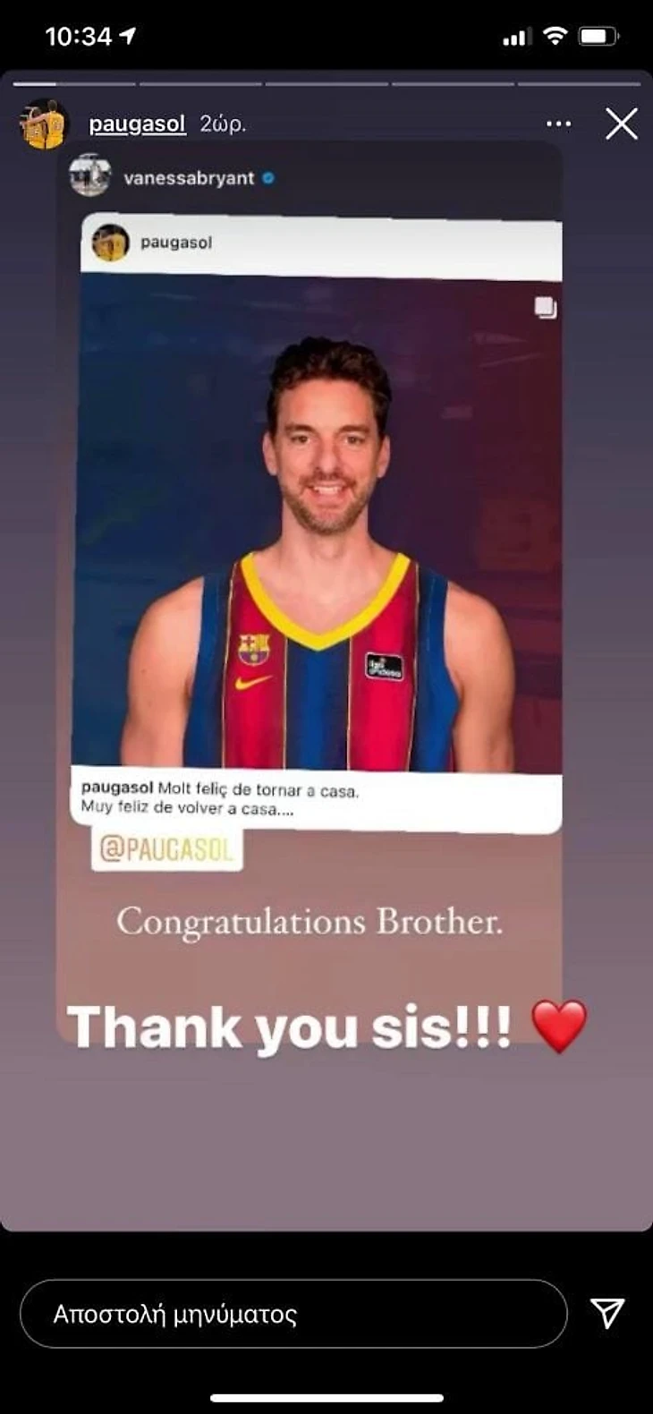 Вдова легенды «Лейкерс» Кобе Брайанта, Ванесса Брайант, поздравила испанского центрового Пау Газоля с подписанием соглашения с «Барселоной».