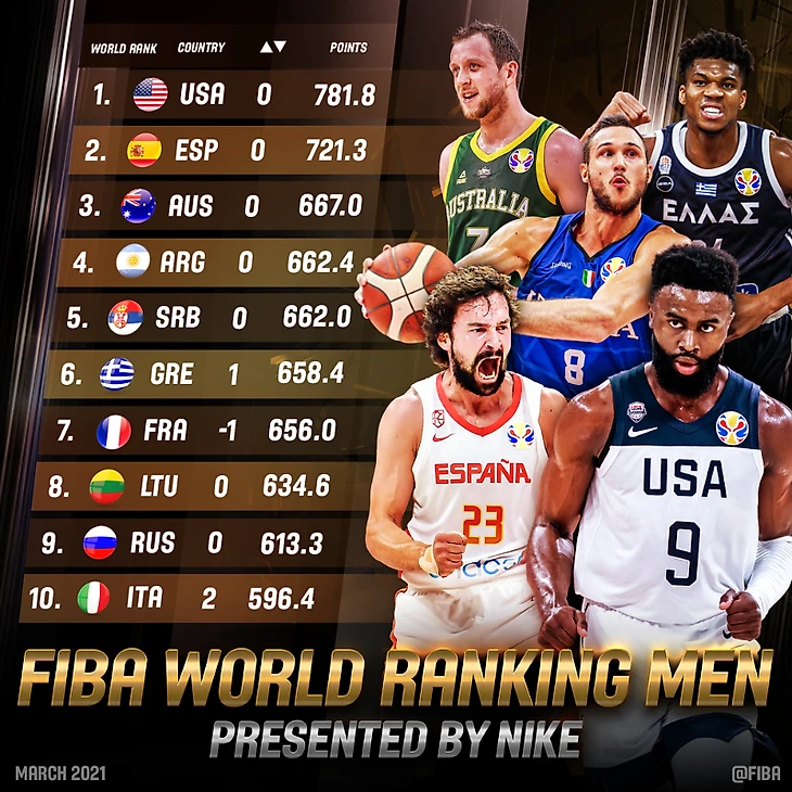 Пятерка лидеров осталась неизменной: США, Испания, Австралия, Аргентина и Сербия. Команда Греции потеснила Францию с 6-й строчки.