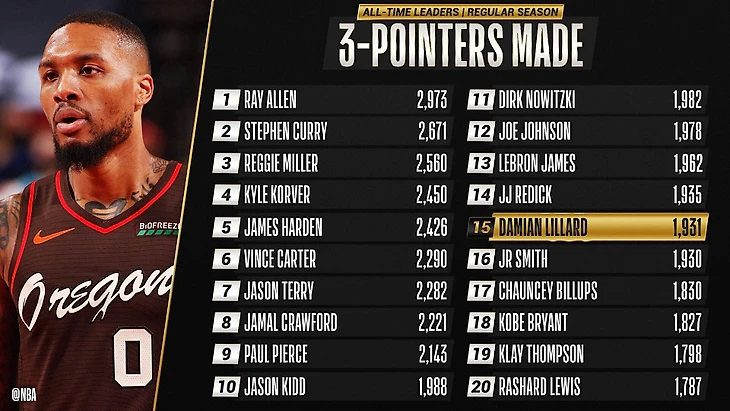Дэмиан Лиллард вышел на 15-е место по реализованным 3-очковым в НБА