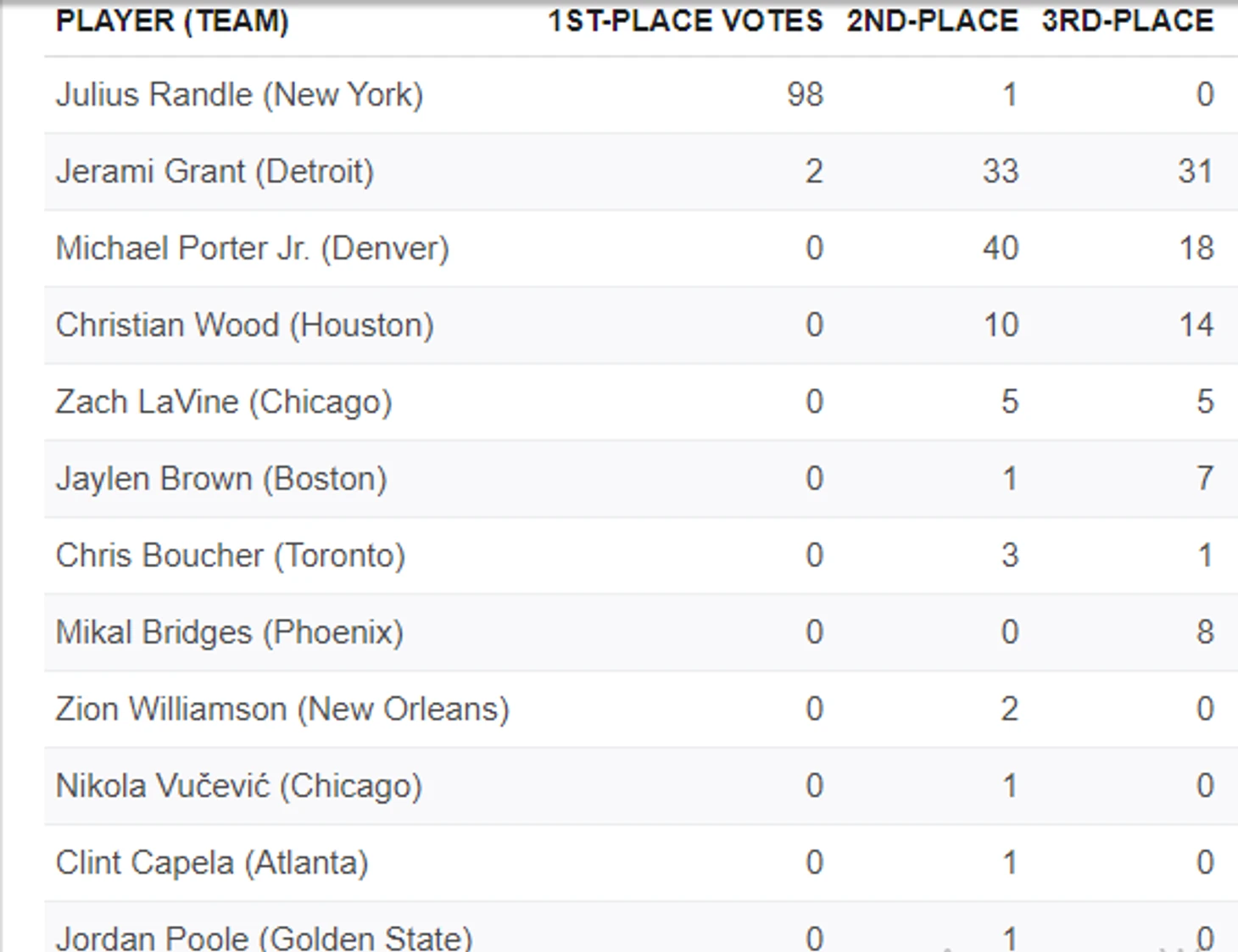 Рэндл по итогам голосования журналистов получил 98 первых мест из 100 возможных. Второе место занял Джерами Грант из «Детройта», ему достались два оставшихся первых голоса. Третьим стал Майкл Портер из «Денвера».