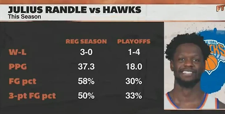 В регулярном чемпионате Рэндл победил во всех 3 матчах с «Хоукс», он набирал 37,3 очка за встречу, реализуя 58% с игры и 50% трехочковых. В плей-офф с тем же соперником он стал забивать 18 очков, реализуя теперь лишь 30% с игры и 33% из-за дуги. Он всегда проходил только в левую сторону и вообще не использовал правую руку. «Хоукс» читали все его действия, игра Джулиуса была абсолютно предсказуемой.