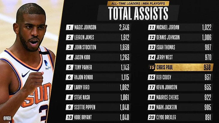 Разыгрывающий «Финикса» Крис Пол в четверг вышел на 15-е место в истории плей-офф НБА по результативным передачам.