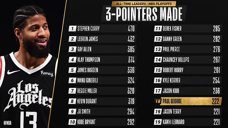Пол Джордж поднялся на 18-е место в истории НБА по забитым трехочковым в плей-офф