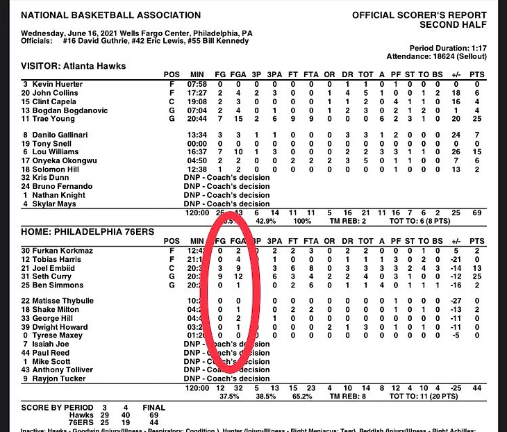 «Хоукс» переиграли «Сиксерс» со счетом 69:44 после смены сторон. Во второй половине встречи Джоэл Эмбиид (3 из 9) и Сет Карри (9 из 12) оказались единственными в составе хозяев, кто отметился попаданиями с игры.