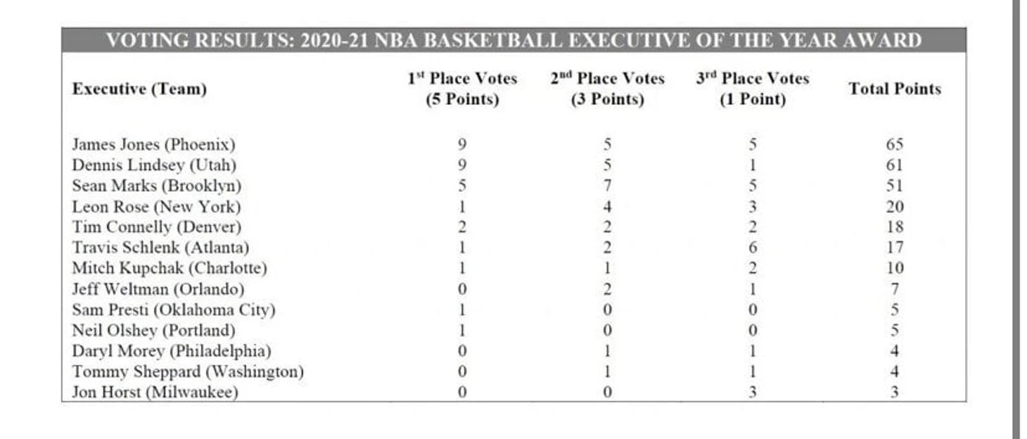 Джонс победил в голосовании, получив 65 баллов. На втором месте – генеральный менеджер «Юты» Деннис Линдсей. Далее идут Шон Маркс («Бруклин»), Леон Роуз («Нью-Йорк») и Тим Коннелли («Денвер»).