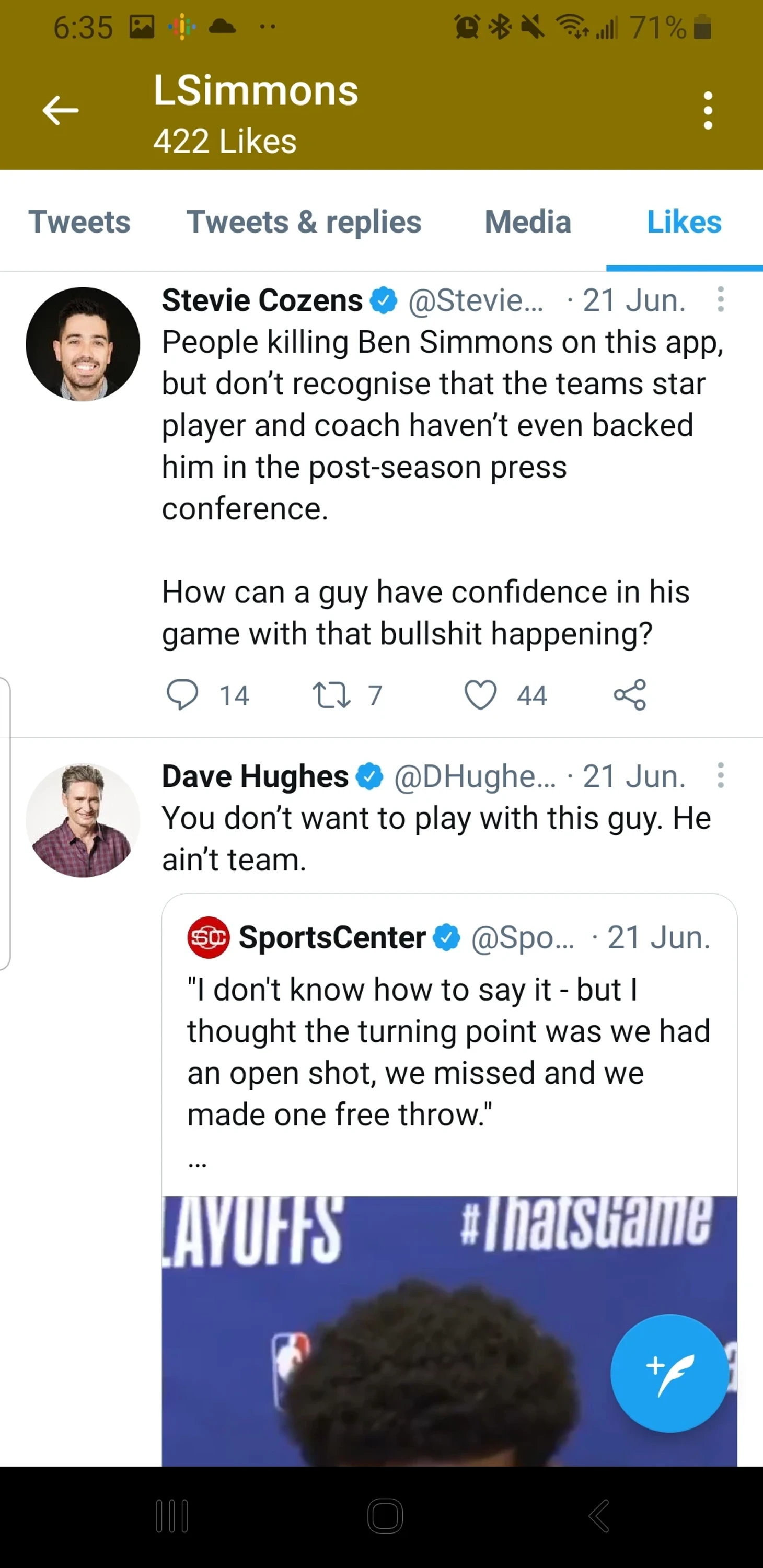 В твитах говорится о том, что Симмонсу трудно сохранять уверенность в собственных силах, когда у него нет поддержки со стороны тренера и звезды команды.