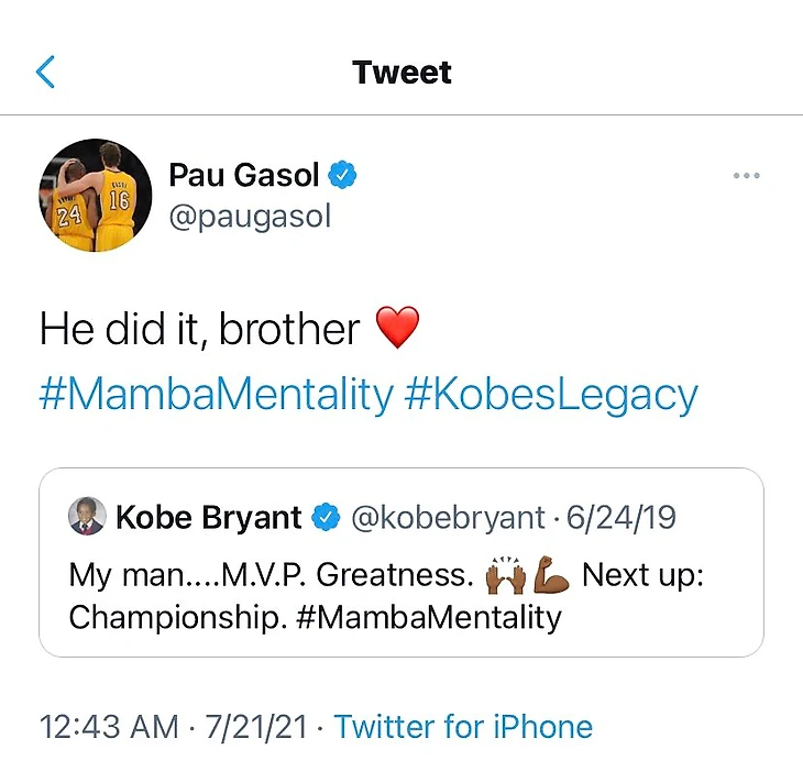 Двукратный чемпион НБА в составе «Лейкерс» Пау Газоль после победы «Милуоки» в финале-2021 обратился в твиттере к погибшему экс-партнеру по команде, легендарному Кобе Брайанту.