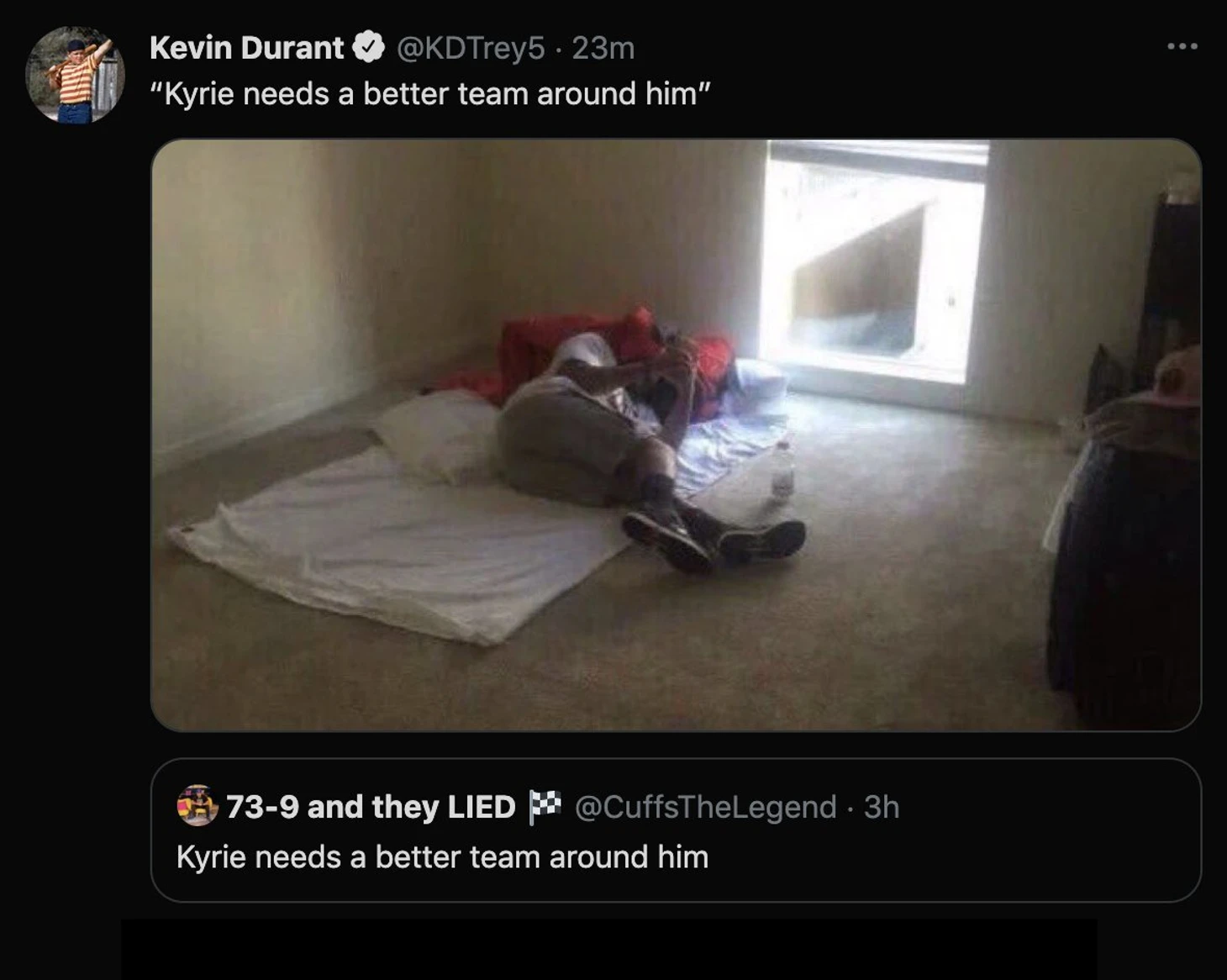 Находящийся в Японии одноклубник Ирвинга Кевин Дюрэнт отреагировал на пост 73-9 and they LIED в 6 утра по местному времени.