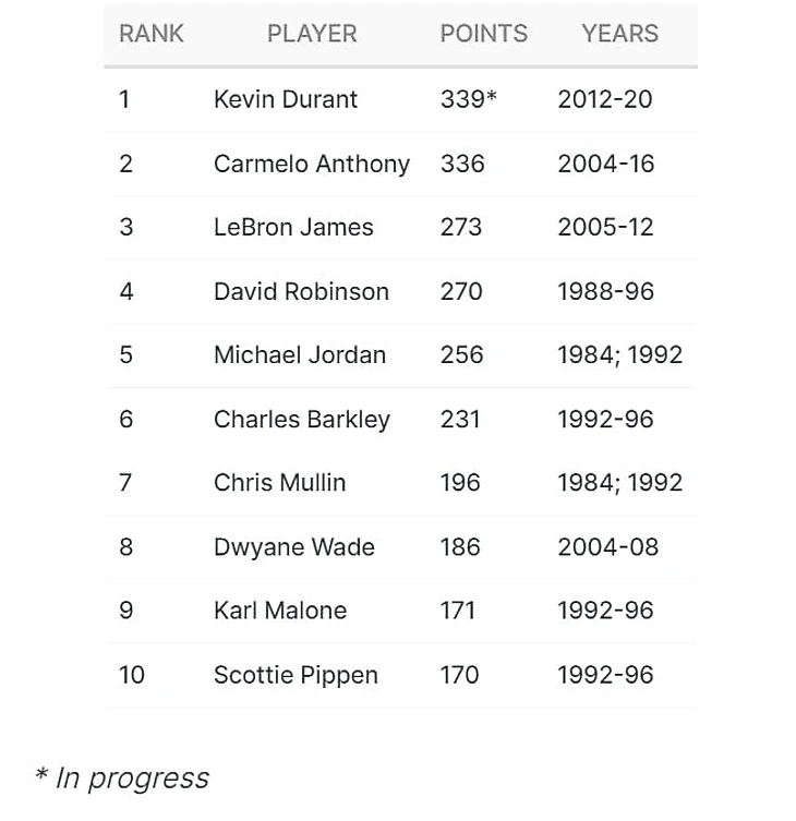 На счету 37-летнего Кармело, игравшего на четырех Олимпиадах (2004, 2008, 2012, 2016), 336 очков при 10,8 в среднем за матч. Дюрэнт начинал турнир в Токио с 311 очком (19,4 за встречу), это третьи летние Игры в карьере Кевина (2012, 2016, 2020).