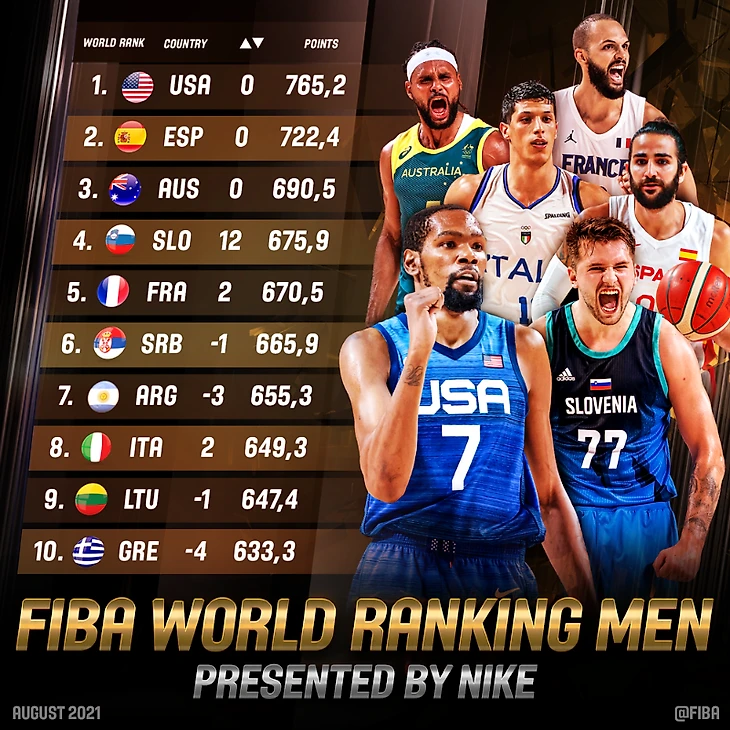 Самый впечатляющий рывок совершила сборная Словении, поднявшаяся с 16-й позиции на 4-ю. На Играх в Токио команда Луки Дончича осталась без медалей, заняв 4-е место.