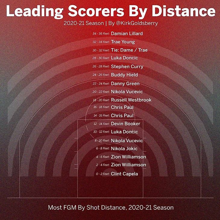 Аналитик ESPN Кирк Голдсберри опубликовал инфографику, на которой наглядно показано, кто стал лучшим бомбардиром НБА сезона-2020/21 с той или иной дистанции.