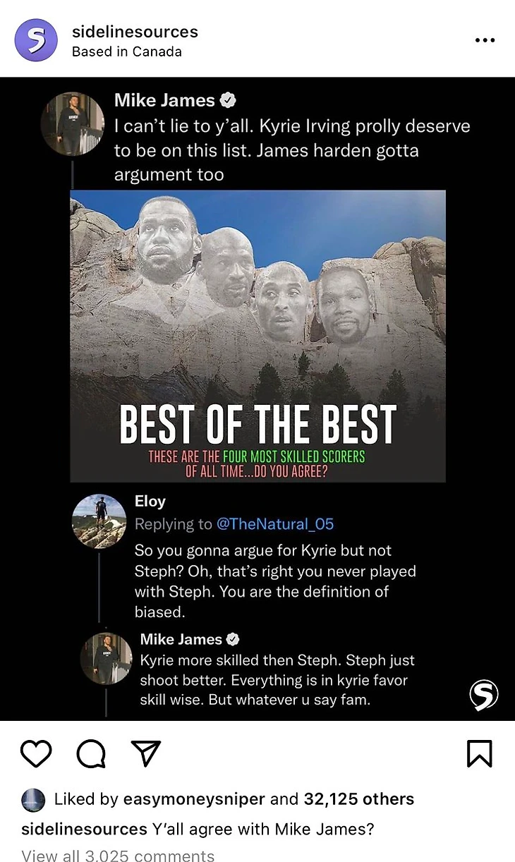 Дюрэнт лайкнул пост, в котором Майк Джеймс называет Ирвинга более умелым игроком, чем Карри