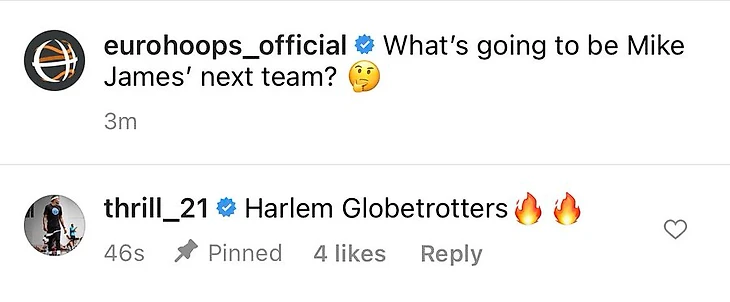 Форвард ЦСКА Уилл Клайберн отреагировал на пост сайта Eurohoops в инстаграме, который поинтересовался, в какой команде продолжит карьеру экс-защитник армейцев Майк Джеймс.