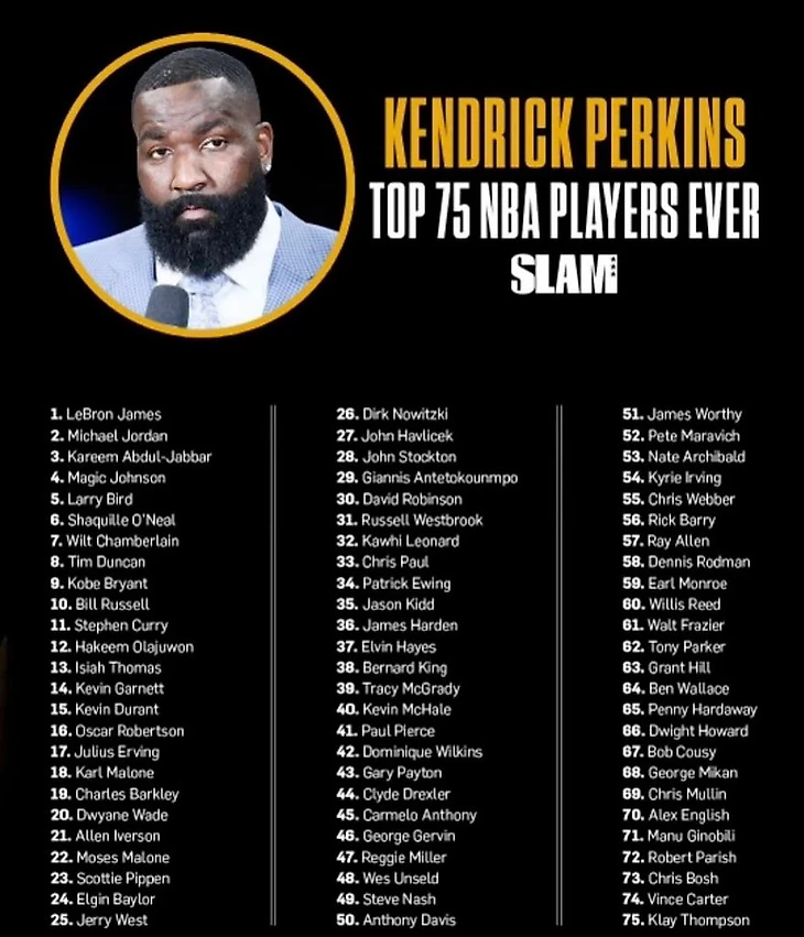 Чемпион НБА, эксперт Кендрик Перкинс составил персональный рейтинг Топ-75 игроков НБА всех времен.