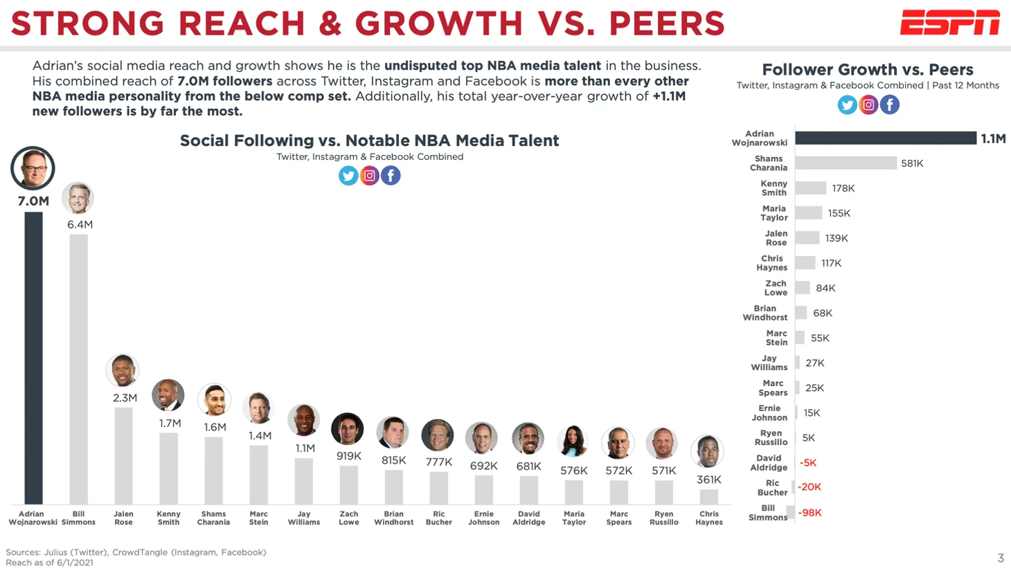 Файл PowerPoint содержит подробный анализ социальных сетей, в котором показано превосходство Воджнаровски над его коллегами, включая других сотрудников ESPN.