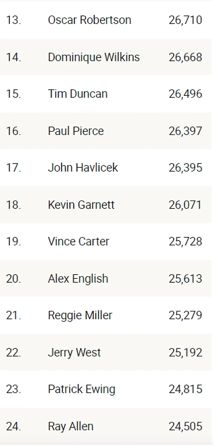 На 24-й строчке завершивший карьеру Рэй Аллен (24 505 очков).