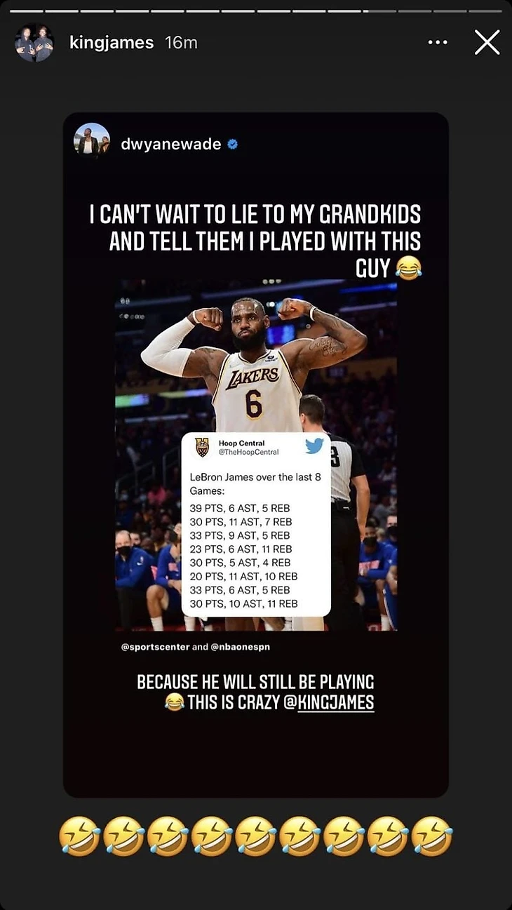 «Не могу дождаться, когда солгу внукам, сказав, что играл с этим парнем. Потому что он все еще будет играть. Это безумие», – написал Уэйд под статистикой Леброна в последних восьми матчах.