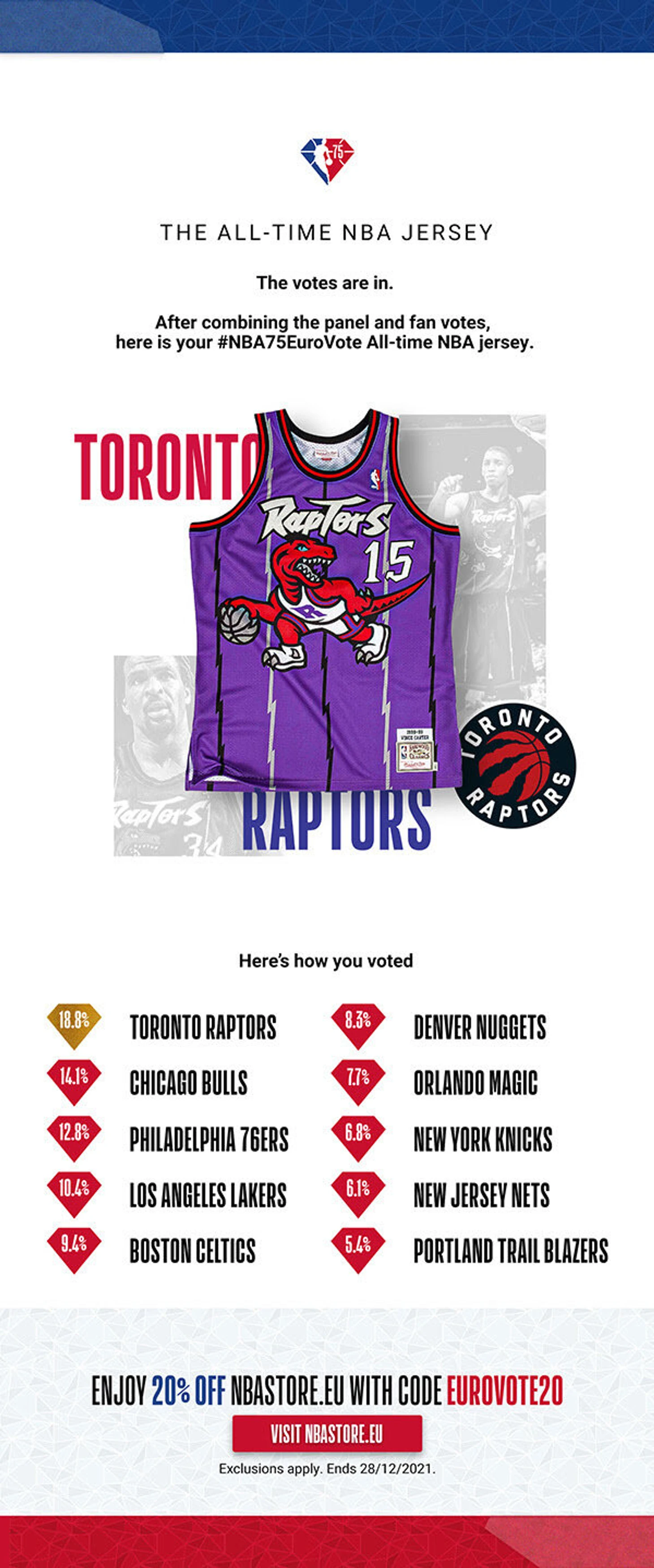 Наибольшее количество болельщиков со всего мира (18,8 процента) проголосовало за форму «Торонто» с динозавром, которая когда-то считалась уродливой. На втором месте – черная форма «Чикаго» 90-х годов, самая продаваемая форма в истории (14,1). На третьем – форма «Филадельфии», в которой Аллен Айверсон играл в финальной серии (12,8).
