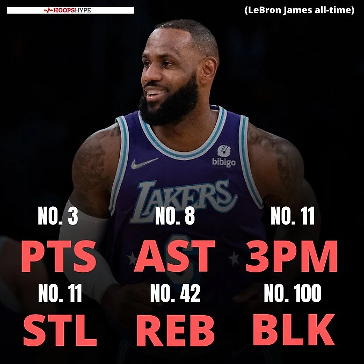 Форвард «Лейкерс» Леброн Джеймс на этой неделе стал единственным игроком в истории НБА, который входит в Топ-100 лиги сразу по набранным очкам, подборам, передачам, блок-шотам, перехватам и точным 3-очковым.