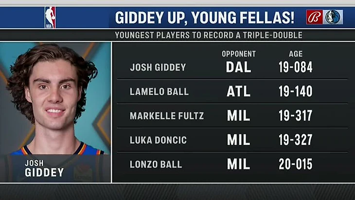 Новичок «Тандер» Джош Гидди записал на свой счет трипл-дабл в матче с «Мэверикс» (86:95), набрав 17 очков, 13 подборов 14 передач.