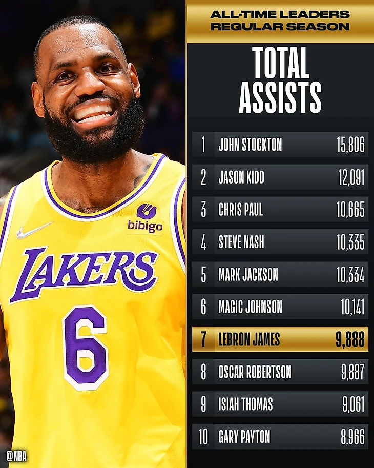 Форвард «Лейкерс» Леброн Джеймс в воскресенье поднялся на 7-е место в истории НБА по передачам за карьеру.