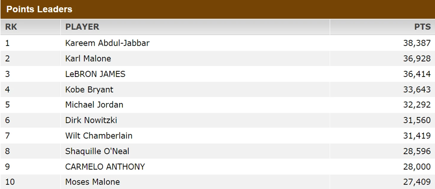 37-летний Энтони занимает 9-е место в списке самых результативных игроков в истории лиги, помимо него в из действующих баскетболистов в Топ-10 его одноклубник Леброн Джеймс.