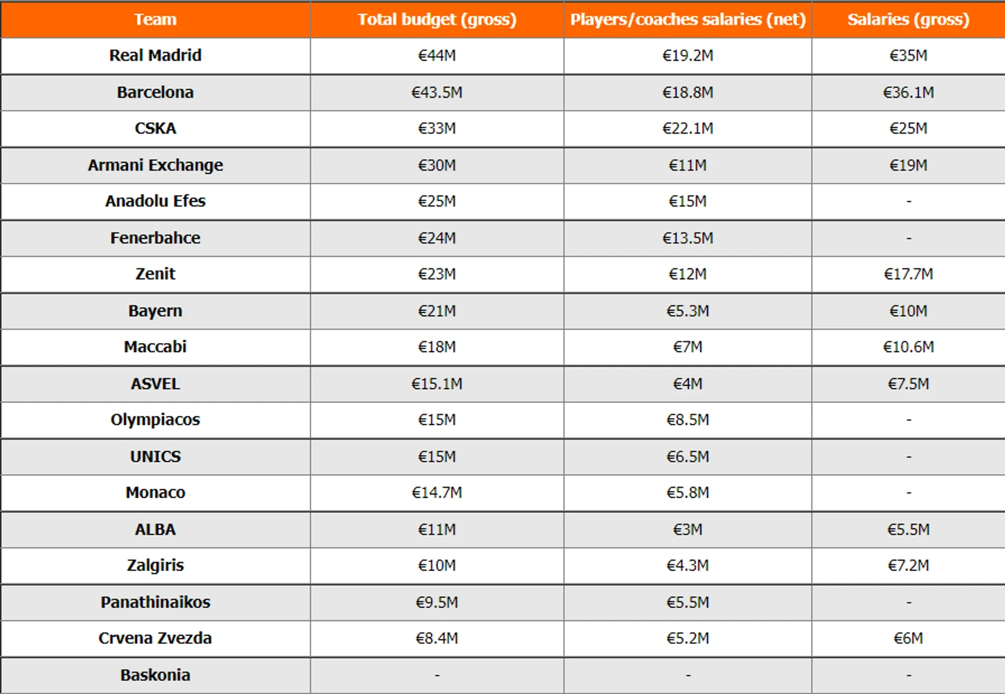Самым крупным бюджетом в Евролиге обладают испанские «Реал» (44 миллиона евро) и «Барселона» (43,5 миллиона). При этом у занимающего третье место ЦСКА (33 млн) самая большая зарплатная ведомость (22,1 млн без налогов).