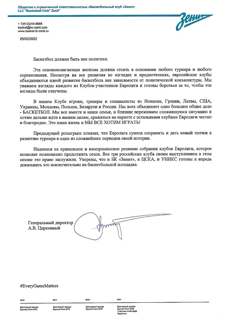 «Баскетбол должен быть вне политики», – говорится в заявлении «Зенита».