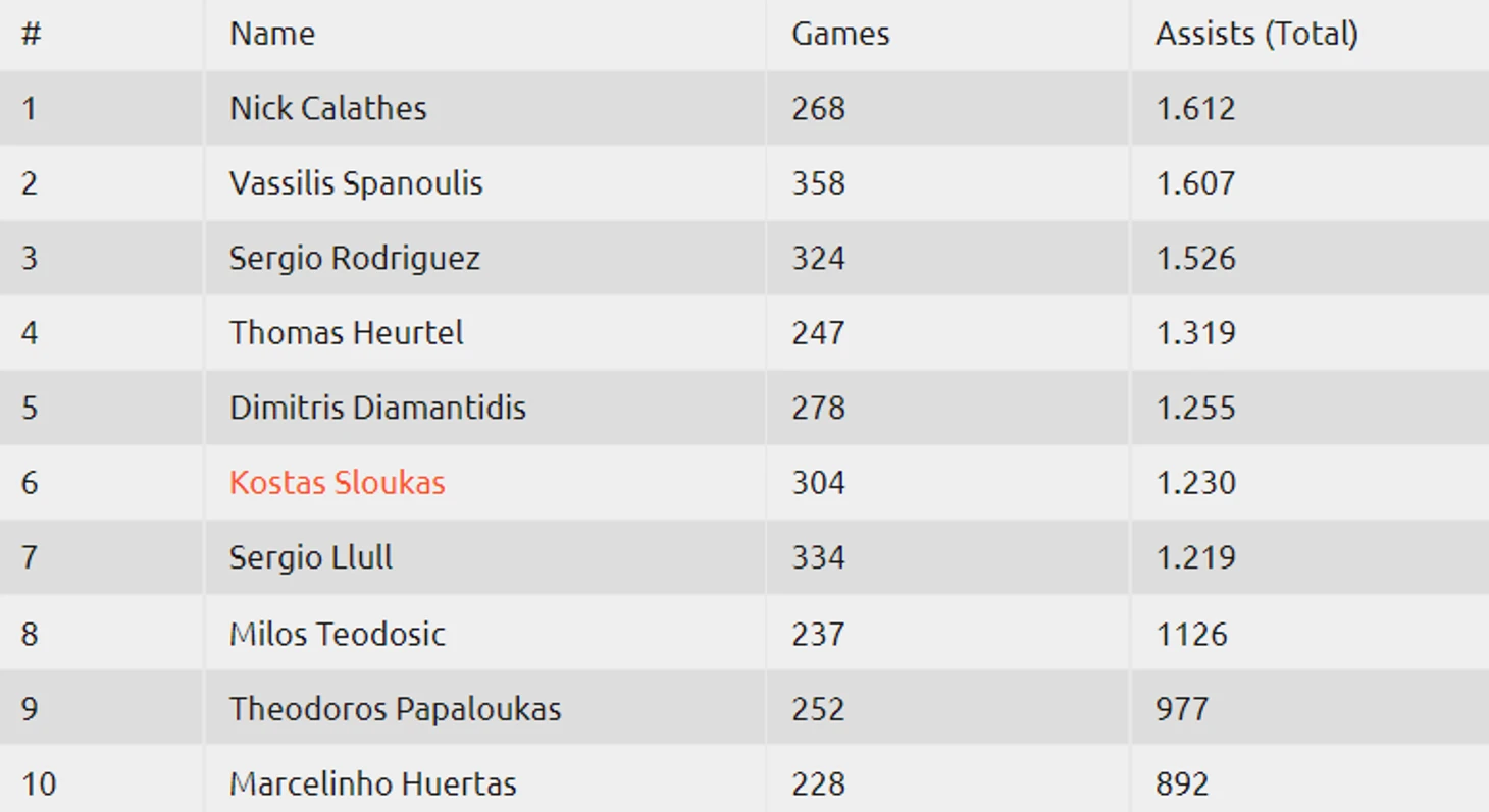 Вторая передача Калатеса в победном матче 28-го раунда с «Монако» позволила ему обойти бывшего одноклубника Вассилиса Спанулиса (1607 за карьеру в Евролиге). Ник в итоге довел карьерный показатель до отметки 1612.