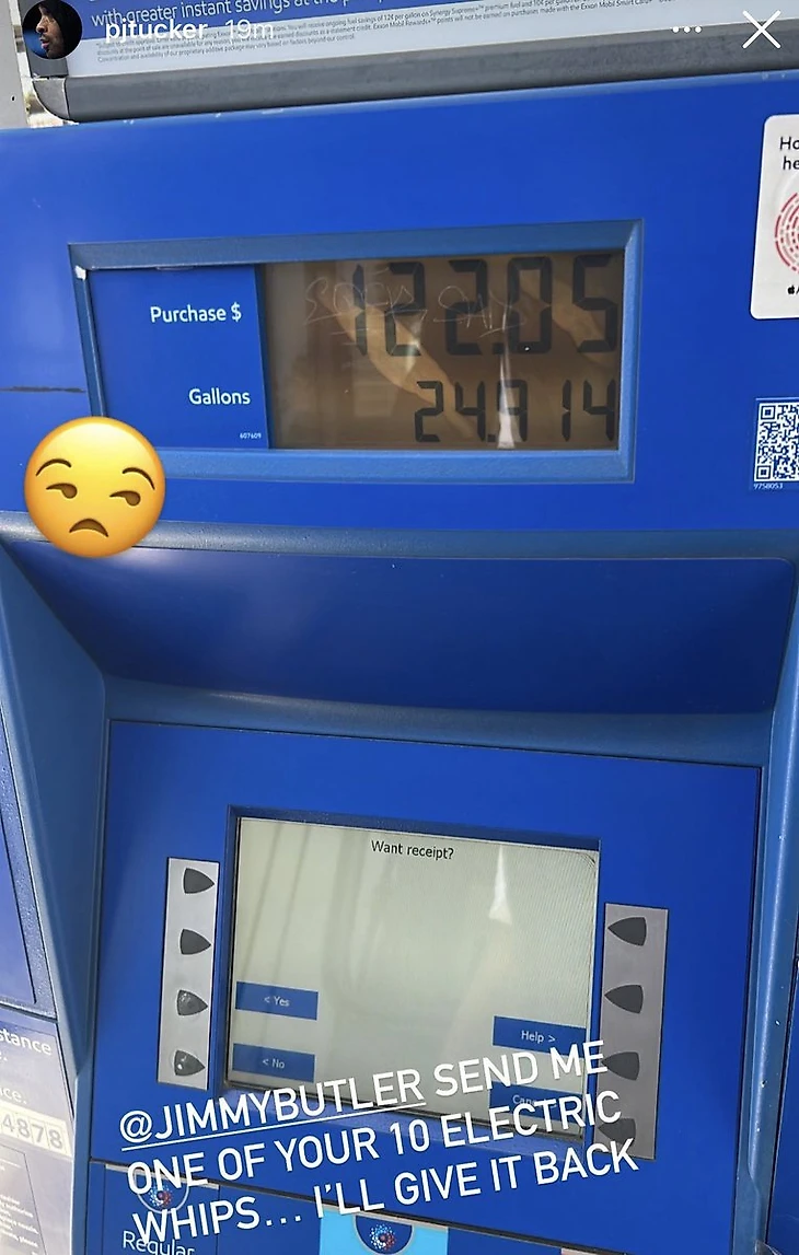 «Джимми Батлер, пришли мне один из твоих 10 электрокаров. Я верну», – написал игрок в сторис, опубликовав фото бензоколонки.