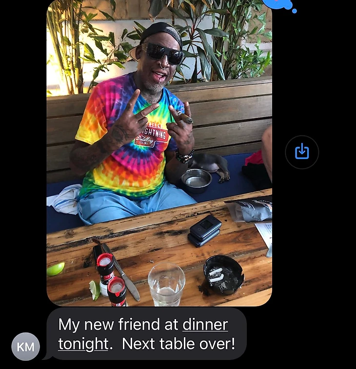 Женщина увидела Родмана в кафе во время ужина, он был там вместе со своей спящей собакой. Она попросила 5-кратного чемпиона о фотографии для сына, тот оказался дружелюбно настроен и пообщался с ней.