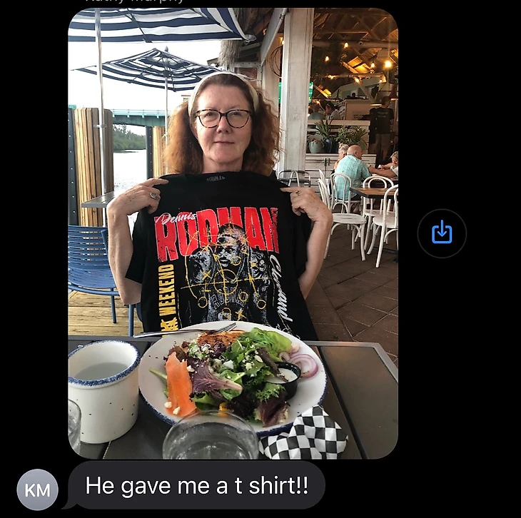 Мама болельщика НБА подружилась с Родманом во время ужина. Он подарил ей футболку