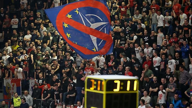 Болельщики «Црвены Звезды» развернули на трибуне антинатовский флаг и скандировали «Сербия-Россия»