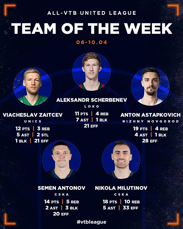 В пятерку лучших игроков недели вошли Александр Щербенев («Локомотив-Кубань»), Вячеслав Зайцев (УНИКС), Антон Астапкович («Нижний Новгород»), Семен Антонов и Никола Милутинов (оба – ЦСКА).