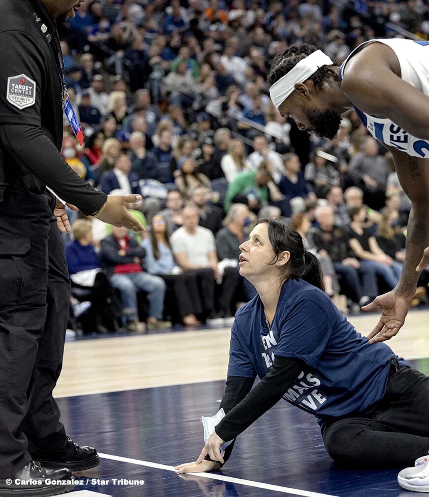 Во время того, как игрок «Миннесоты» исполнял штрафные броски, на другой стороне болельщица неожиданно вышла на площадку и попыталась приклеить руку к паркету.