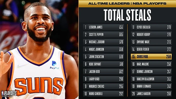Разыгрывающий «Финикса» Крис Пол в воскресенье вышел на 15-е место в истории НБА по перехватам в плей-офф.