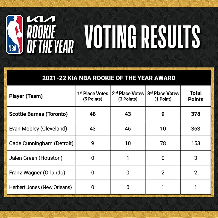 По итогам финального раунда голосования он набрал 378 очков, опередив Эвана Мобли из «Кливленда» (363) и Кейда Каннингема из «Детройта» (153). Это наименьший отрыв лидера за все 19 сезонов после введения нынешней системы голосования.