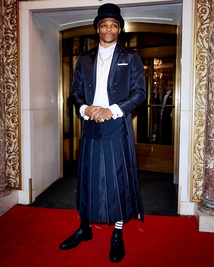 Уэстбрук пришел на мероприятие в оригинальном наряде с юбкой и цилиндром.