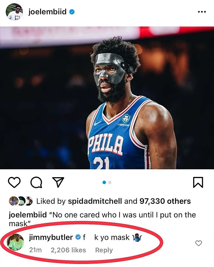 Бывший одноклубник Эмбиида, лидер «Хит» Джимми Батлер в шутку написал в комментариях: «Пошел ты со своей маской».