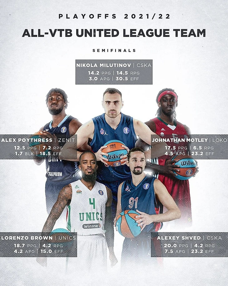 Алексей Швед, ЦСКА Лоренцо Браун, УНИКС Алекс Пойтресс, «Зенит» Джонатан Мотли, «Локомотив-Кубань» Никола Милутинов, ЦСКА.