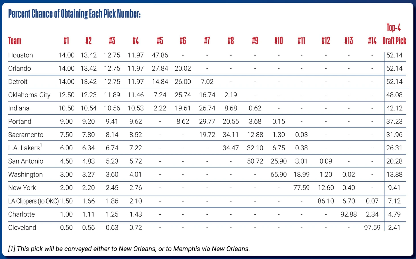 Главными претендентами на первый пик являются «Хьюстон», «Орландо» и «Детройт» (по 14%). Кроме того, каждая из этих команд с вероятностью 52,14% будет выбирать в Топ-4.