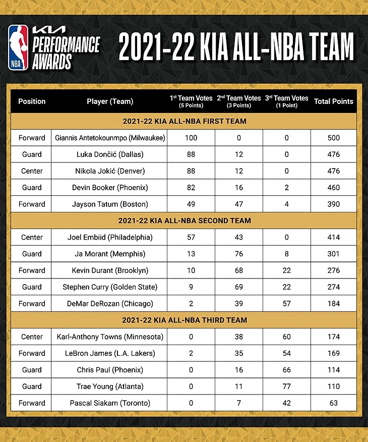 В первую пятерку вошли: Яннис Адетокумбо («Милуоки»), Лука Дончич («Даллас»), Никола Йокич («Денвер»), Девин Букер («Финикс») и Джейсон Тейтум («Бостон»).