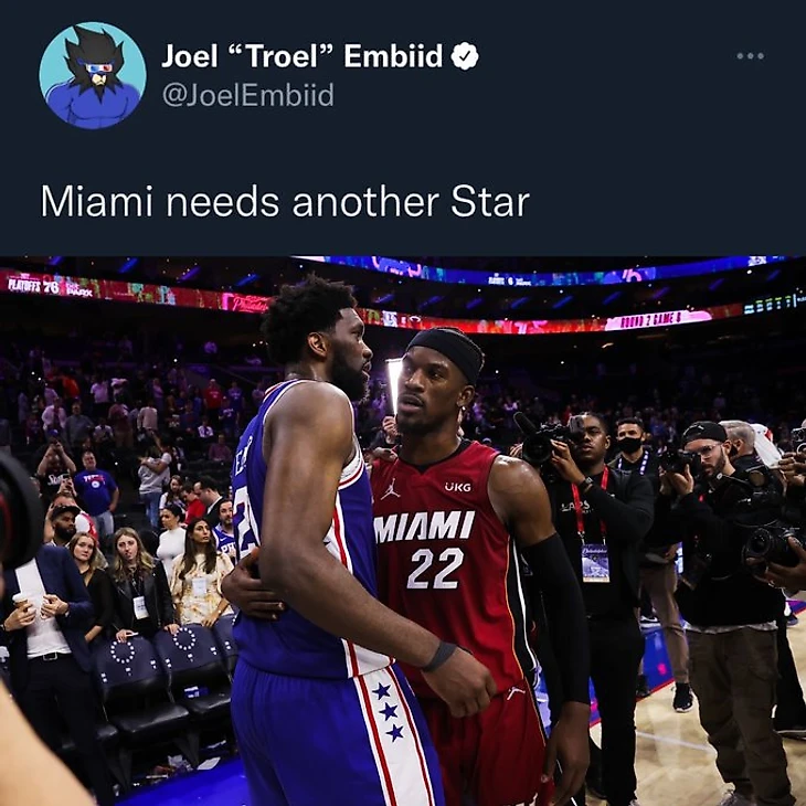 Звездный центровой «Филадельфии» Джоэл Эмбиид под занавес встречи написал в твиттере: «Майами» нужна еще одна звезда».