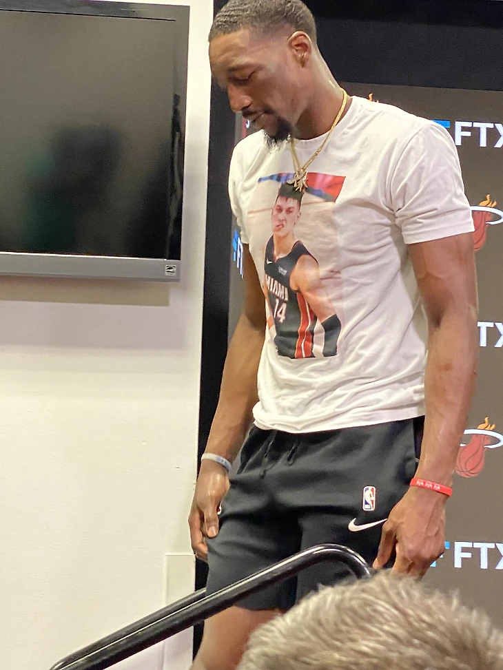 Форвард «Майами» Бэм Адебайо был одет в футболку с изображением своего одноклубника Тайлера Хирро во время пресс-конференции перед седьмым матчем финала Востока против «Бостона» (3-3).