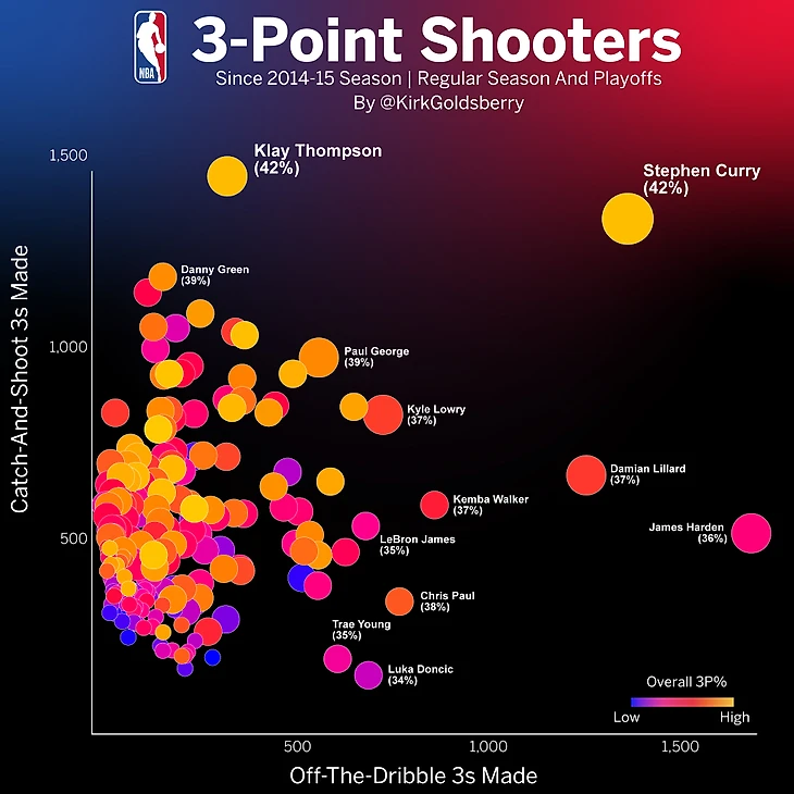Стефен Карри и Клэй Томпсон – лидеры по реализации дальних бросков без ведения с 2014 года, Джеймс Харден – после дриблинга